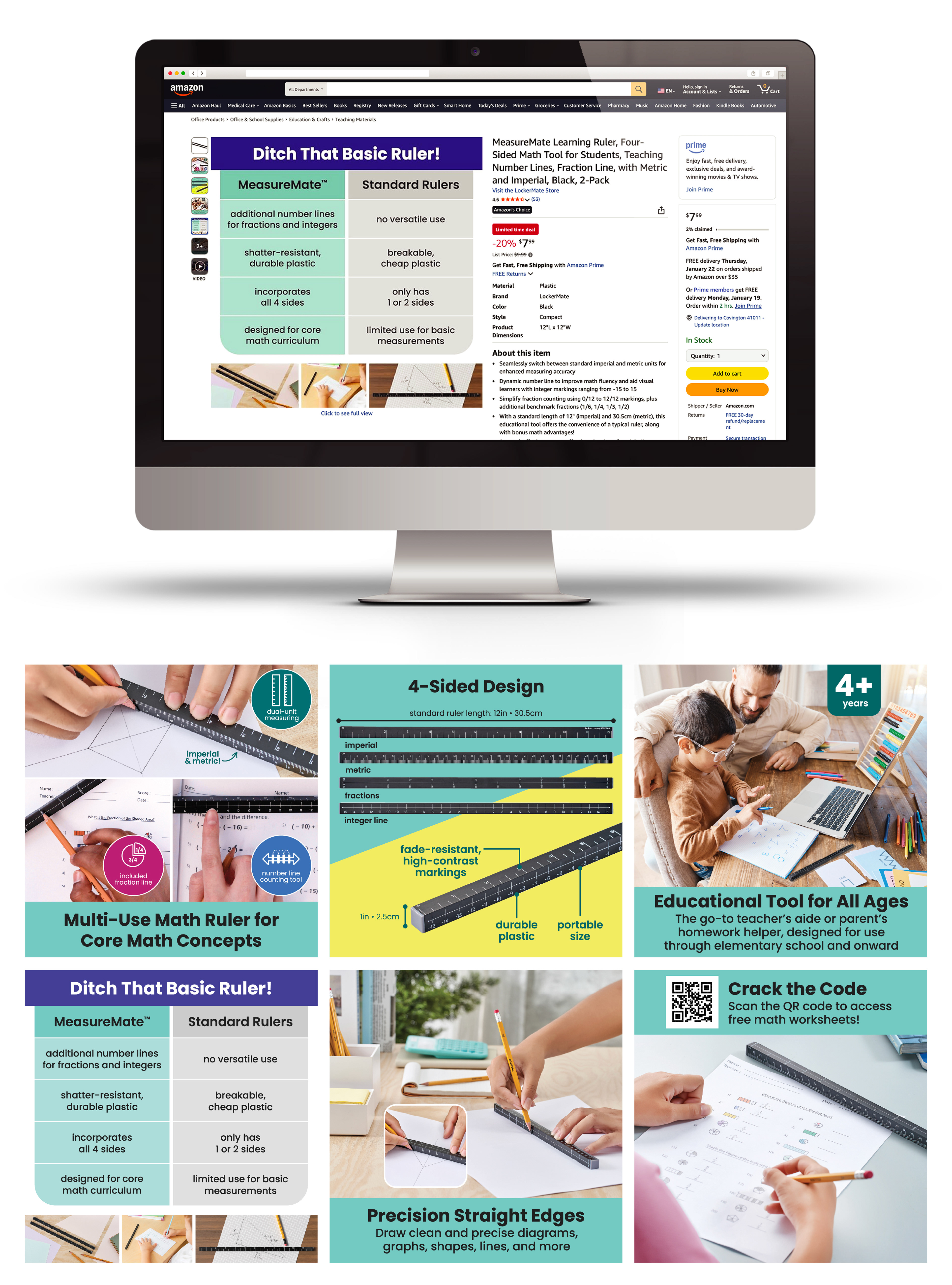 From naming and copywriting to product carousel imagery, this launch required a full scope of research-based and creative thinking. We emphasized MeasureMate's unique positioning within today's standard ruler assortment, both digitally and in brick and mortar, to fill gaps in retail shelving, boost visibility in the appropriate online categories, and ultimately inspire a need-to-buy mentality for consumers.