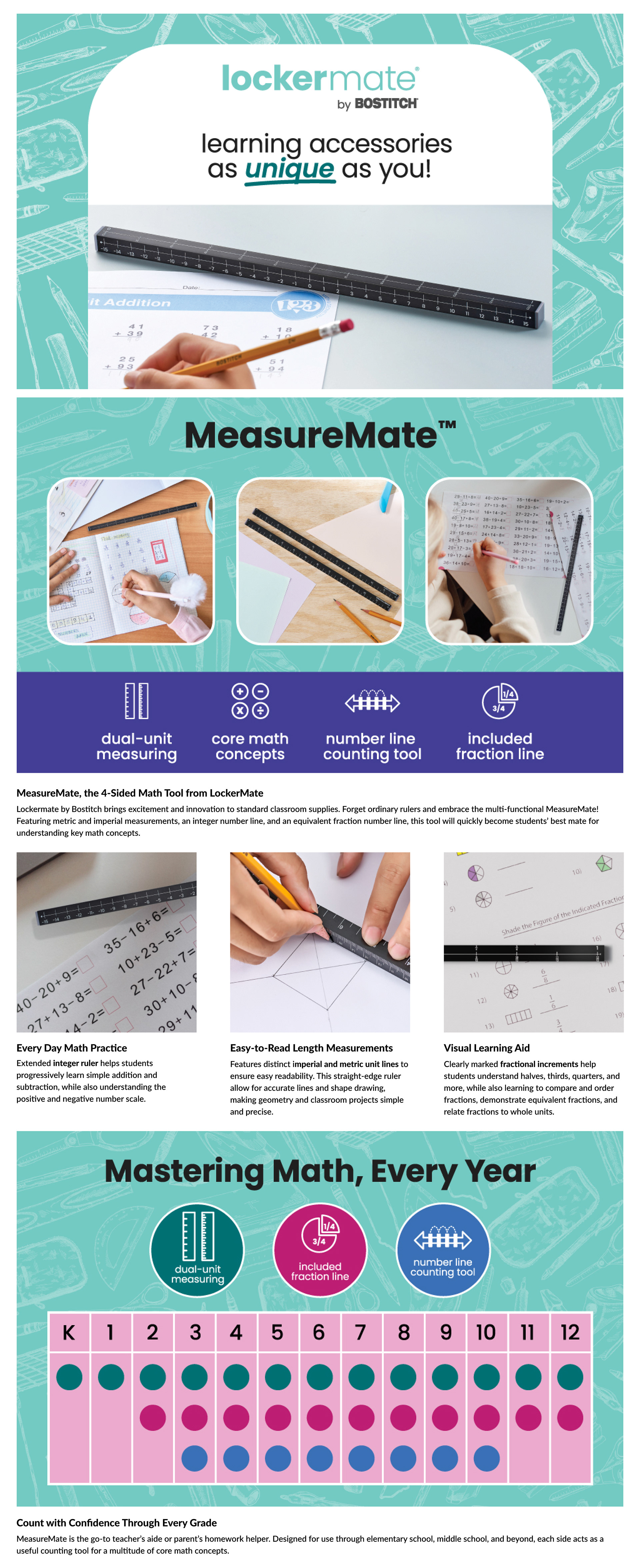 LockerMate by Bostitch puts another fun twist on ordinary classroom products. Forget ordinary rulers and embrace MeasureMate, a multi-functional, new-to-the-market math tool! Featuring metric and imperial measurements, an integer number line, and an equivalent fraction number line, this four-sided ruler is made for core curriculum math concepts through elementary school, middle school, and beyond.